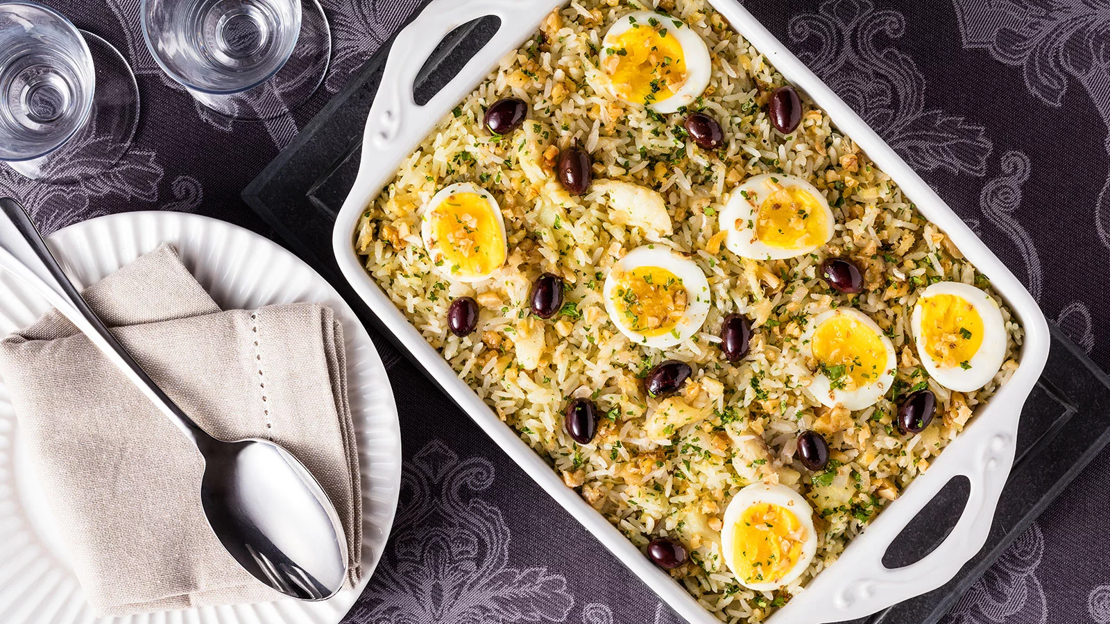 Modo de preparo: prepare o arroz de acordo com as instruções da embalagem, deixe esfriar e reserve. Em uma frigideira, aqueça o azeite e doure a cebola. Logo em seguida, junte o bacalhau e tempere com a pimenta. Caso necessário, adicione sal a gosto. Em uma tigela misture: o arroz, o bacalhau, 100 g de nozes, o parmesão, a salsa picada e por último a nata. Coloque em um refratário. Por cima, disponha as rodelas de ovo, as azeitonas e o restante das nozes. Regue com azeite e leve ao forno preaquecido a 200° C até aquecer. Dicas: se não encontrar a nata, substitua por requeijão.