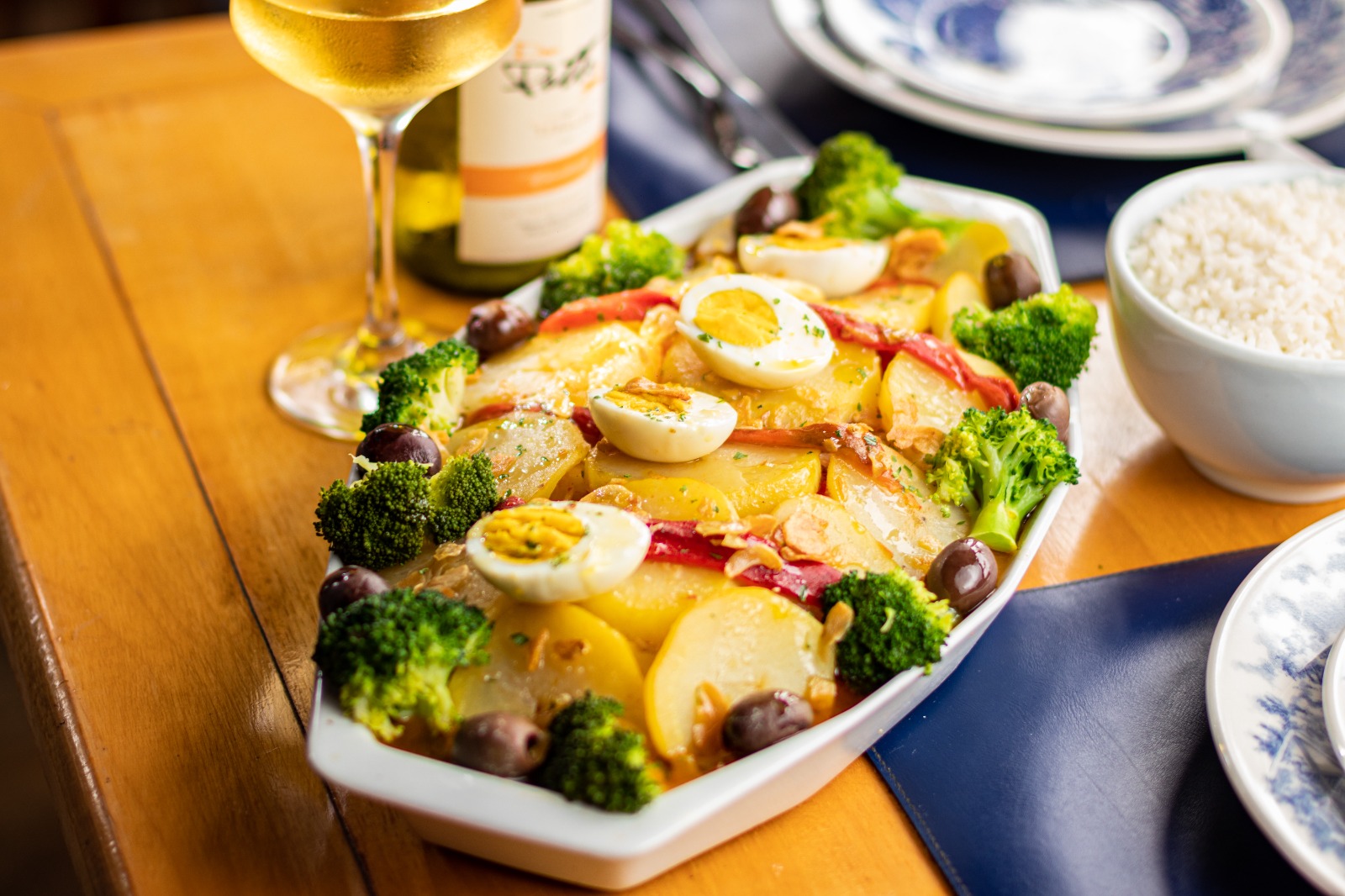 Modo de preparo: corte a cebola, o pimentão, a batata descascada e os tomates em rodelas. Reserve. Em uma travessa faça camadas com as batatas, o pimentão e a cebola, coloque o bacalhau e cubra com cebola, tomate, pimentão e batata. Ajuste o sal. Leve ao forno, coberto com alumínio, a 170 graus por 1 hora ou até cozinhar. Retire o alumínio e finalize com o brócolis, o ovo cozido, a azeitona preta e o alho laminado. Regue com um bom azeite e bom apetite