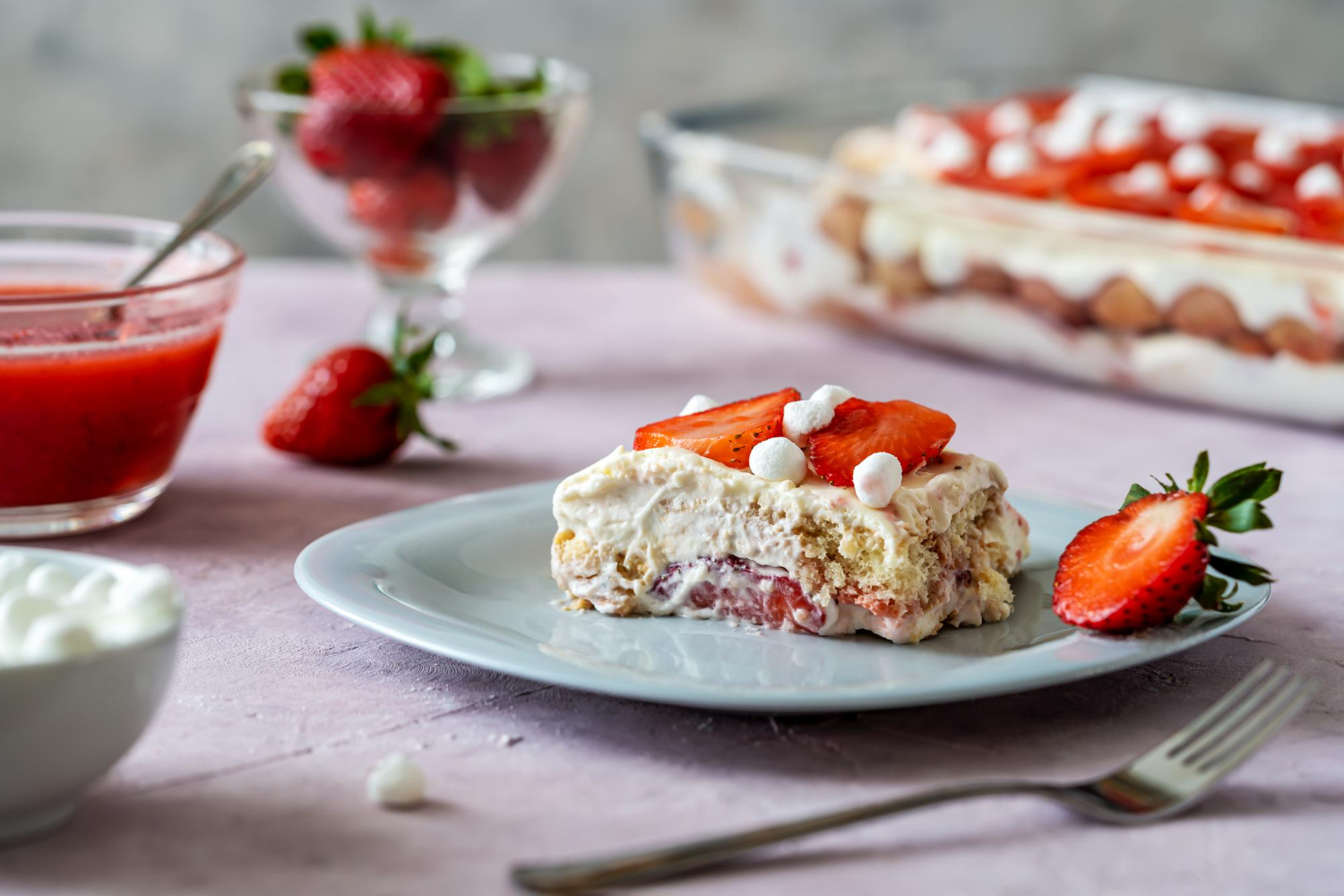 Adicione uma camada de morangos picados e espalhe mais creme por cima.