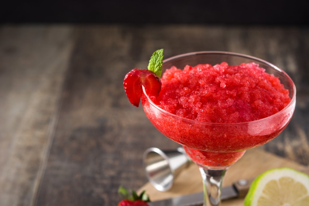 - Montagem: Em copos altos, coloque uma camada generosa de gelo picado e, em seguida, despeje a mistura de morango por cima. Mexa levemente para misturar.