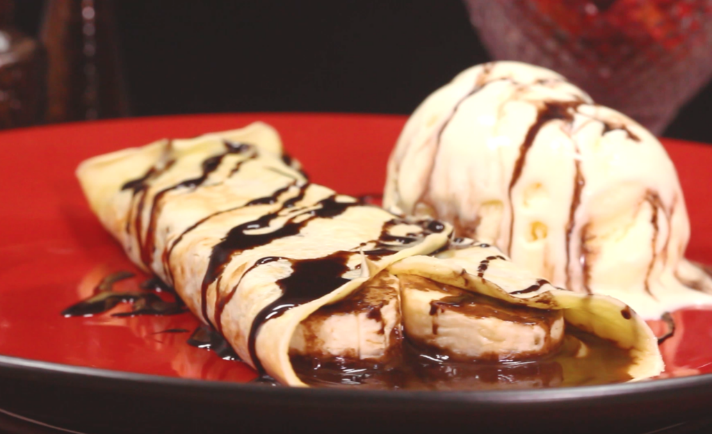 - Despeje a calda de chocolate da panqueca e do sorvete.
