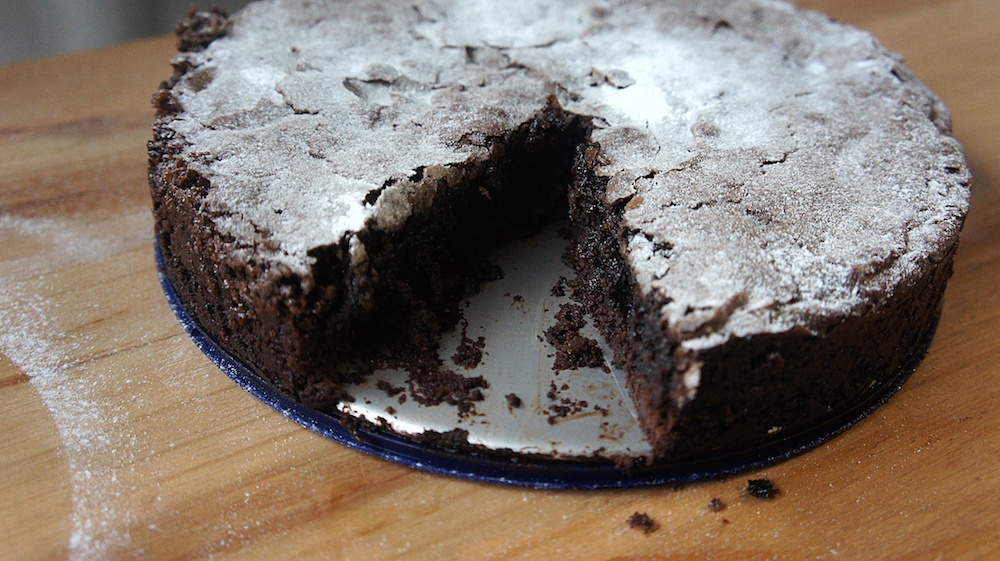 Não sei se daria para enquadrar este bolo na categoria bolo, acho que está em algum lugar entre um brownie, um bolo e um petit gâteau grande. É uma receita pequena, rápida de fazer e de assar. Você que regula o quão cremoso o interior deve ser, pode de quase cru até quase cozido. Independente do resultado, sirva quentinho com sorvete de creme.