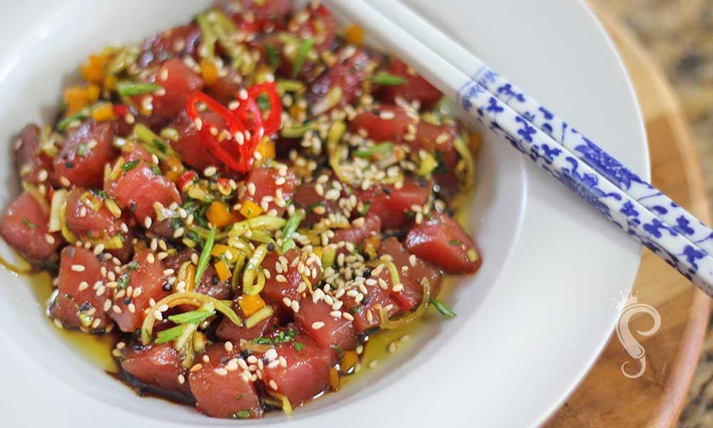 Aqui foi só cortar o atum (tinha 200g, ideal para uma pessoa só) em cubos médios e temperar. No molhinho usei shoyu, óleo de gergelim torrado e um molhinho sweet chilli mas também gosto de usar molho de pimenta Tabasco. Misturei tudo e juntei o atum picado. Mistura de novo e deixa marinar uns minutinhos.