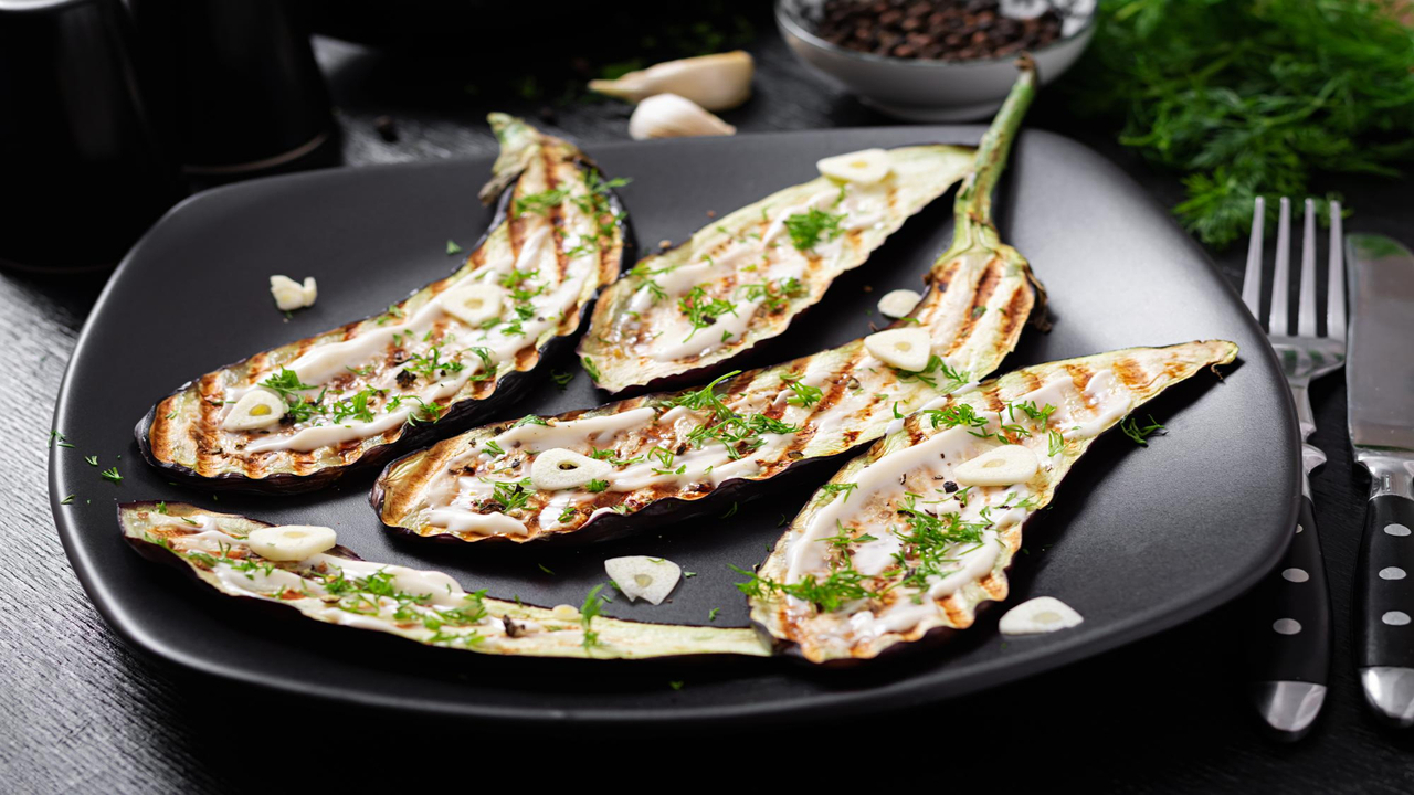 - Disponha as fatias de berinjela grelhada em um prato e regue com o molho de iogurte por cima.